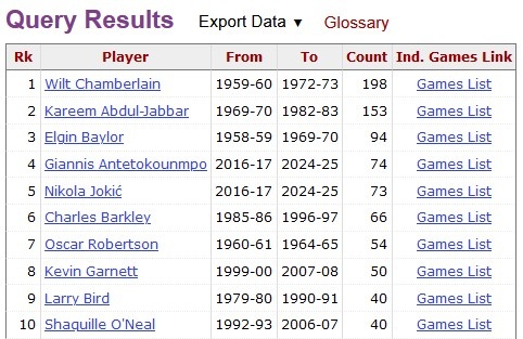 據(jù)統(tǒng)計,這是字母哥生涯第75次砍下至少25分15籃板5助攻,這一成績能排在歷史第四。在他身前的是張伯倫(198次)、賈巴爾(153次)和埃金-貝勒(94次)。