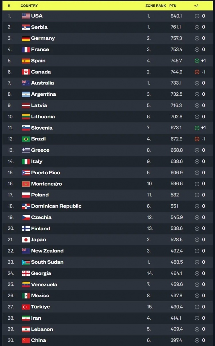 中國男籃現(xiàn)在排名世界第30,亞太區(qū)第六