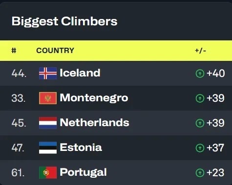 2023年9月,克羅地亞再掉五個名次,排名正式落到中國身后,他們在那個被新納入統(tǒng)計(jì)的窗口期合計(jì)輸給瑞典荷蘭烏克蘭55分,令人無語。