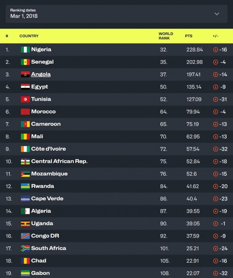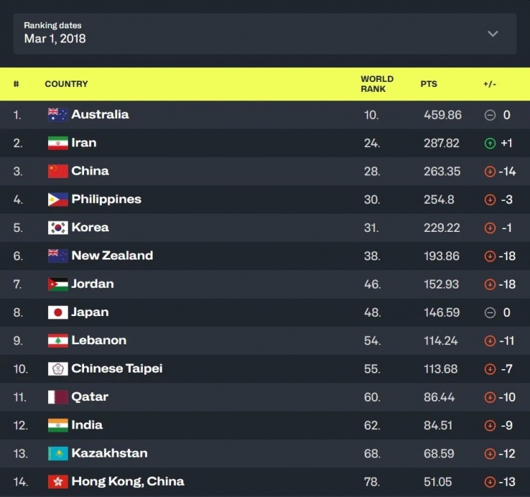 這里可以看到,中國隊(duì)俯沖掉了14名,同樣俯沖的還有非洲區(qū)第一第二尼日利亞和安哥拉,以及大洋洲千年老二新西蘭