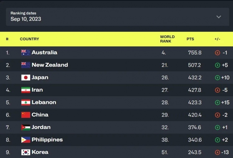 接著,你還要看看對手的世界排名,據(jù)此加上第三個項(xiàng),公式為1.5*(世界排名平均數(shù)-對手排名),這蘊(yùn)含著擊敗越強(qiáng)對手獲益越多、輸給越弱對手懲罰越重的理念。2023年?duì)顟B(tài)強(qiáng)勁的拉脫維亞,曾短期內(nèi)連續(xù)掀翻西班牙、法國、希臘在內(nèi)的多支排名高于自己的強(qiáng)隊(duì),世界杯正賽上更是大勝巴西立陶宛喜提第五,藉此排名從29名暴漲到前八。