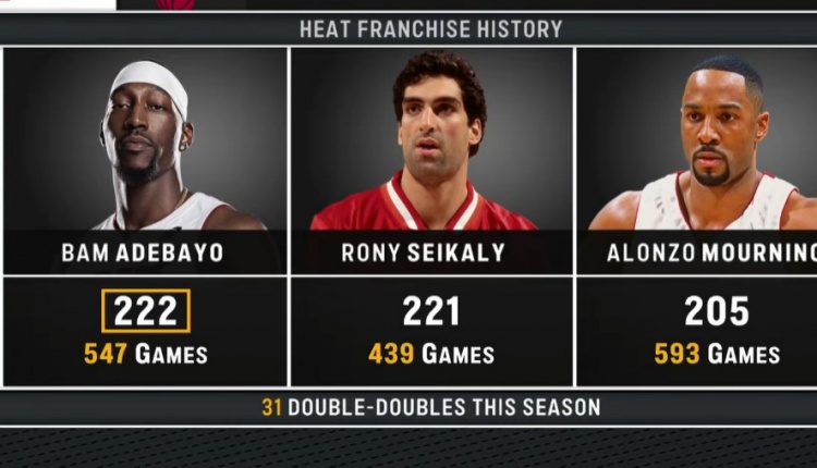 值得一提的是,今天阿德巴約拿到了生涯第222次兩雙,他超越羅尼-塞卡利,加冕熱火隊(duì)史兩雙王。
