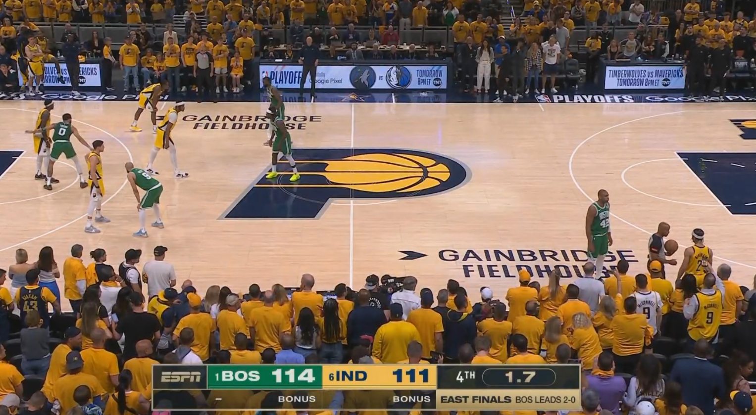 比賽最后時(shí)刻,步行者通過(guò)一個(gè)全場(chǎng)三分戰(zhàn)術(shù)(類似橄欖球的戰(zhàn)術(shù)),由哈利伯頓打成3+1完成絕殺。