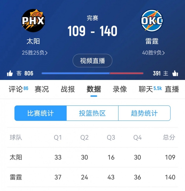 2月6日訊 NBA常規(guī)賽,太陽109-140大比分不敵雷霆。