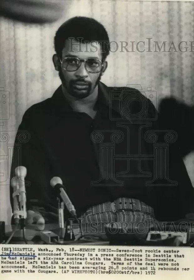 麥克丹尼爾斯在大學(xué)進(jìn)了NCAA全美一陣,隨后在ABA打了一年場(chǎng)均26.8分14籃板,算是全美聞名的超級(jí)新人內(nèi)線