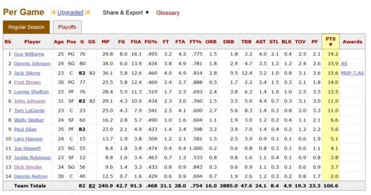 1975-76賽季,超音速成為了全聯(lián)盟最年輕的球隊(duì)。他們的核心是23歲的湯姆-伯利森、24歲的“光頭”沃茨、24歲的萊昂納德-格雷與27歲的弗雷德-布朗。他們斗志昂揚(yáng),球風(fēng)強(qiáng)硬,出人意料地取得了43勝39負(fù)的常規(guī)賽戰(zhàn)績(jī),再次重返季后賽。