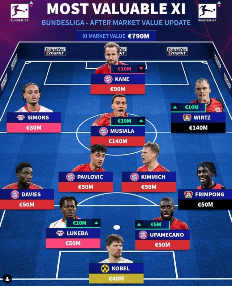 德轉(zhuǎn)列德甲最貴陣:穆西亞拉領(lǐng)銜拜仁6將,維爾茨、西蒙斯在列