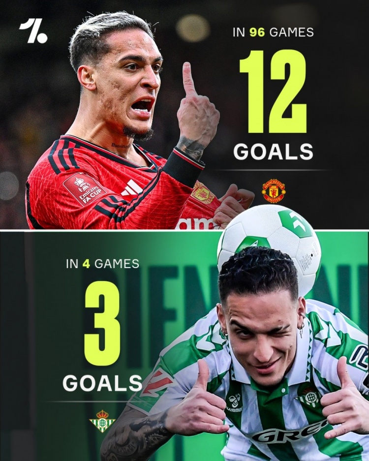 據(jù)OneFootball統(tǒng)計(jì),安東尼在曼聯(lián)出戰(zhàn)96場(chǎng)打進(jìn)12球,加盟貝蒂斯以來(lái)出戰(zhàn)4場(chǎng)比賽攻入3球,進(jìn)球效率顯著提高。