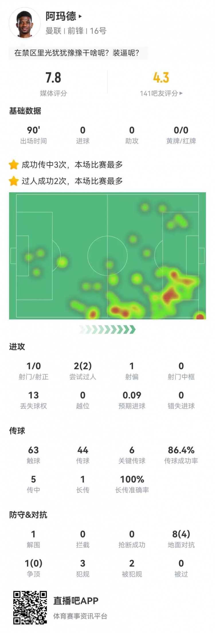 2月3日訊 曼聯(lián)在本輪英超0-2不敵水晶宮,阿瑪?shù)卤緢鰯?shù)據(jù)如下: