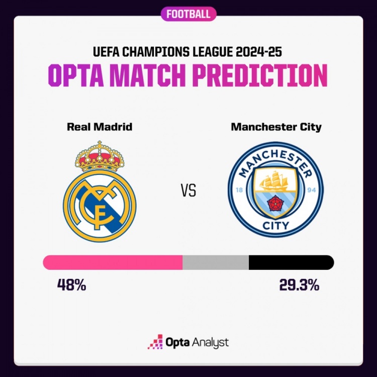 基于賽前大數(shù)據(jù),Opta超級計(jì)算機(jī)運(yùn)行了10000次的模擬比賽,其中48%的模擬比賽結(jié)果顯示,皇馬會在90分鐘內(nèi)獲勝。