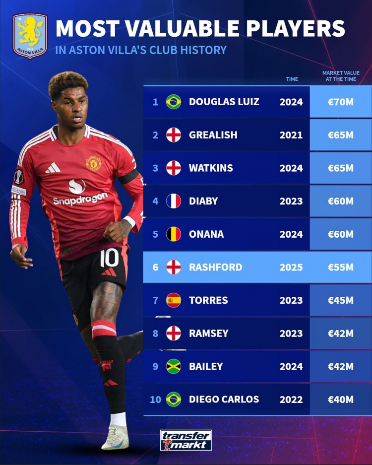 2月3日訊 曼聯(lián)前鋒拉什福德租借加盟維拉,德國轉(zhuǎn)會(huì)市場(chǎng)排出了維拉隊(duì)史球員德轉(zhuǎn)身價(jià)排名,拉什福德以5500萬歐排名第6位。