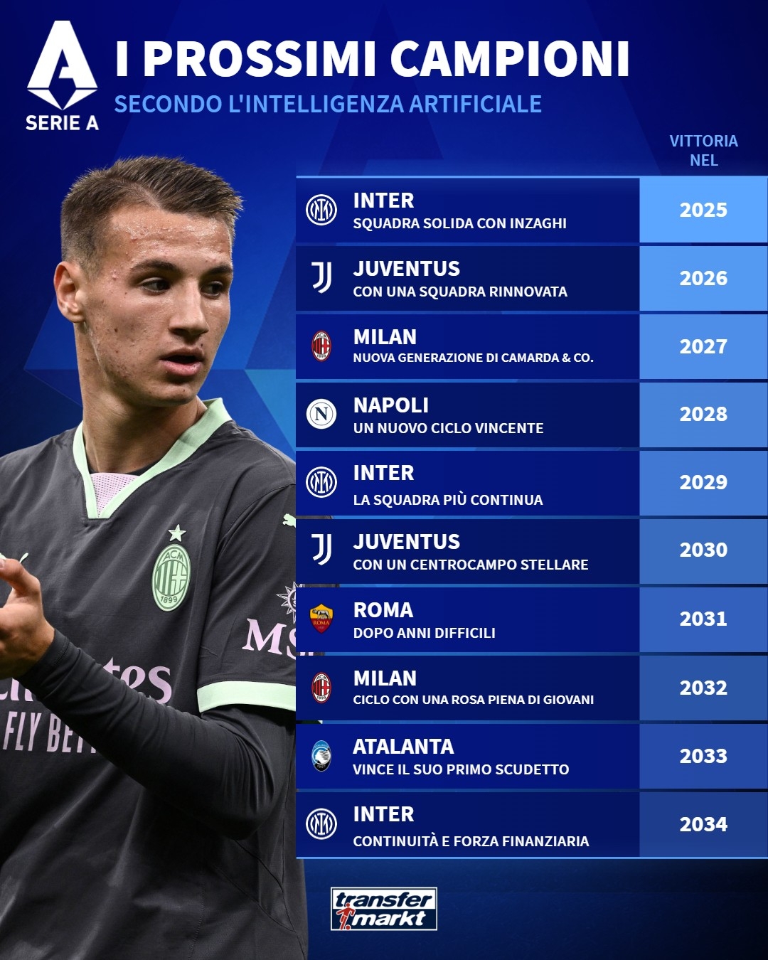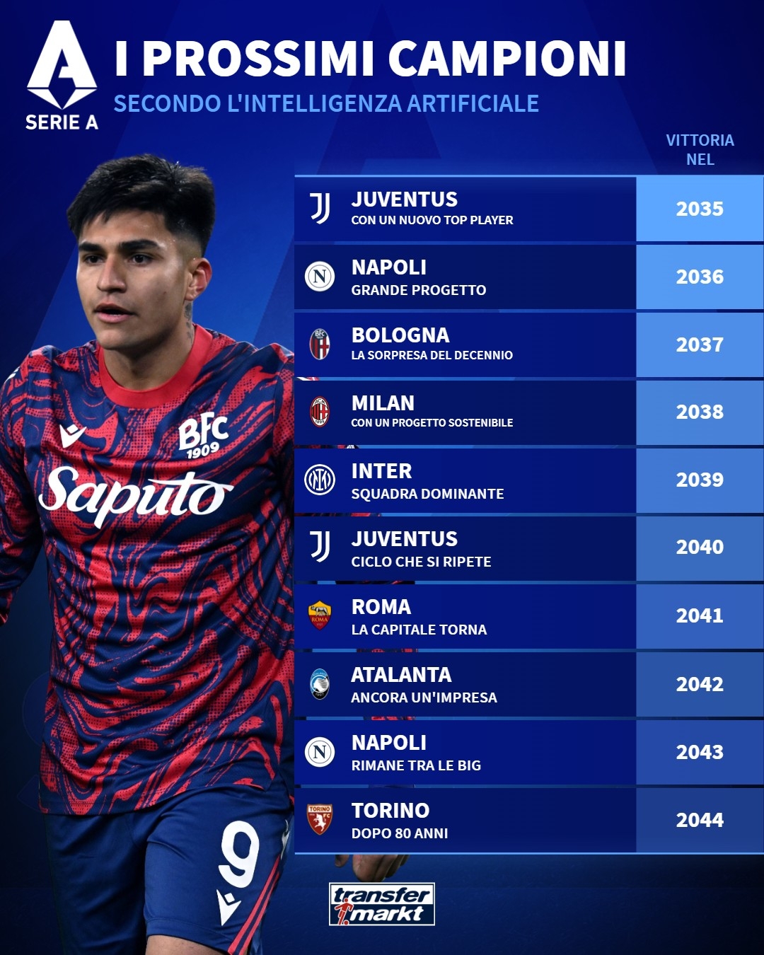 ChatGPT預(yù)測未來20年意甲冠軍:國米、尤文:4冠米蘭、那不勒斯:3冠羅馬、亞特蘭大:2冠博洛尼亞、都靈:1冠 標(biāo)簽: 足球 意甲 AC米蘭 亞特蘭大 國際米蘭 都靈 尤文圖斯 羅馬 那不勒斯 博洛尼亞