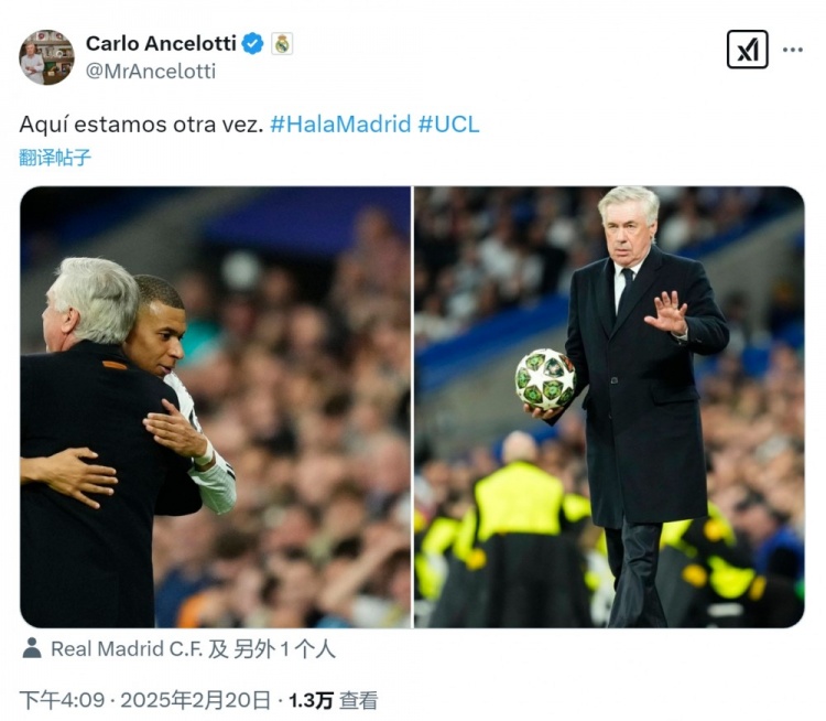 皇馬主帥安切洛蒂更新社媒動(dòng)態(tài),曬出與姆巴佩擁抱的照片,配文:“我們又來了,Hala Madrid!”