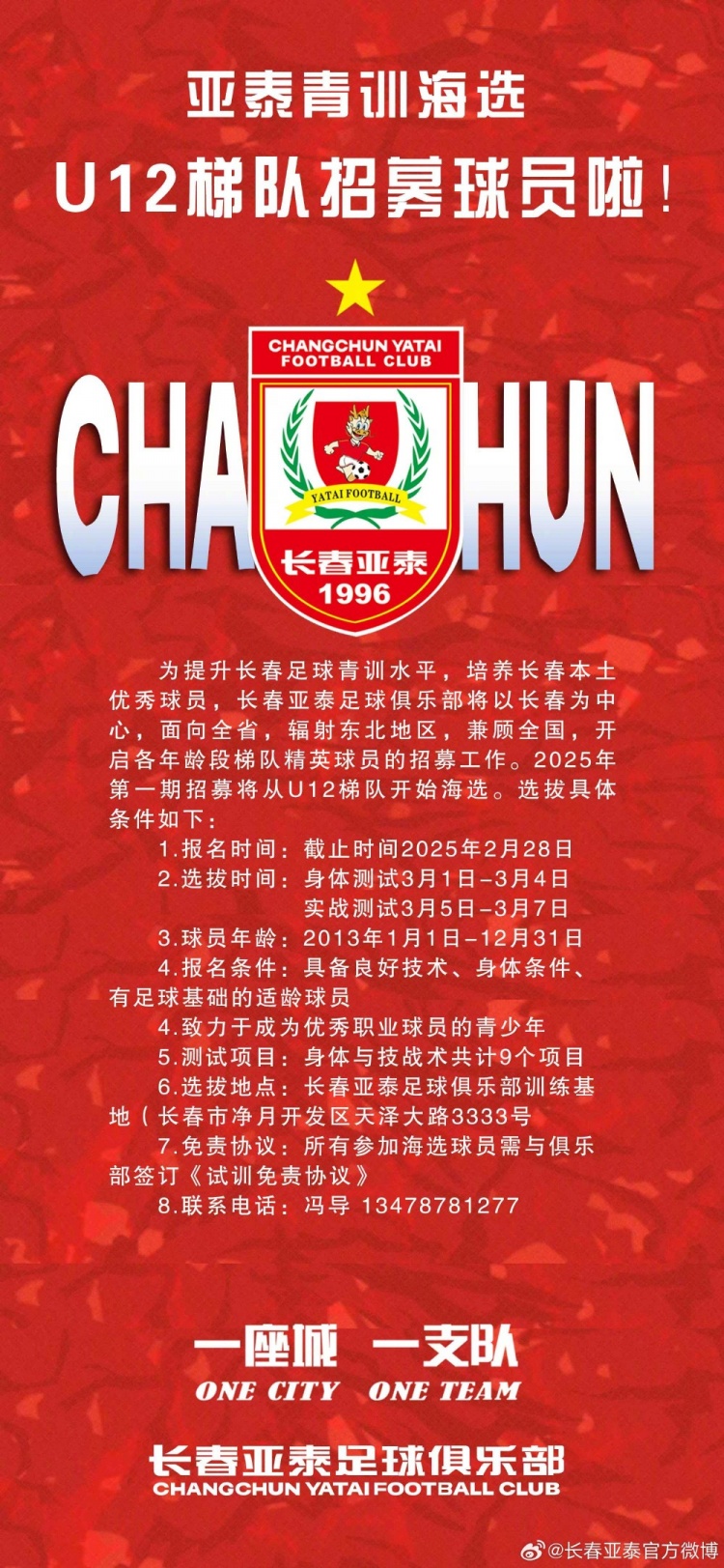 為了可持續(xù)發(fā)展戰(zhàn)略,完善俱樂(lè)部梯隊(duì)建設(shè),長(zhǎng)春亞泰足球俱樂(lè)部將立足本土,以長(zhǎng)春為中心,面向全省,輻射東北地區(qū),兼顧全國(guó),開(kāi)啟各年齡段梯隊(duì)精英球員的招募工作。2025年第一期招募將從U12梯隊(duì)開(kāi)始海選。