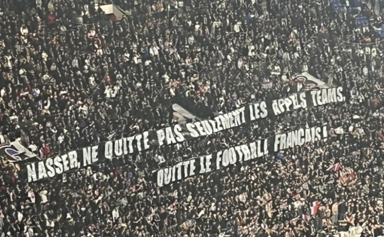 2月24日訊 RMC報道,法甲第23輪里昂主場對陣巴黎的比賽中,部分里昂球迷展示了多條針對巴黎主席納賽爾和卡塔爾的抗議標(biāo)語,要求其退出法國足球。