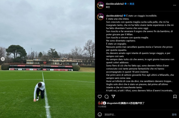 2月3日訊 米蘭前隊長卡拉布里亞即將離隊,加盟博洛尼亞。他更新了社交媒體,寫下長文向米蘭告別。