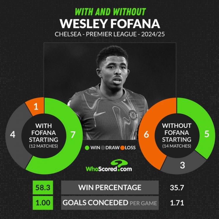 2月26日訊 切爾西在進入2025年后的英超戰(zhàn)績斷崖式下滑,已經(jīng)跌至聯(lián)賽第7位。whoscored數(shù)據(jù)統(tǒng)計顯示,這可能與韋斯利-福法納的缺陣有關(guān):