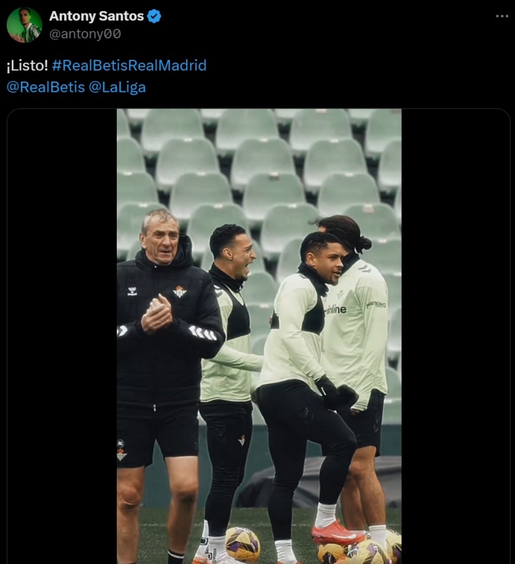 安東尼也通過社媒曬出自己隨隊(duì)備戰(zhàn)的視頻,并配文:“我準(zhǔn)備好了!皇家貝蒂斯vs皇家馬德里!”