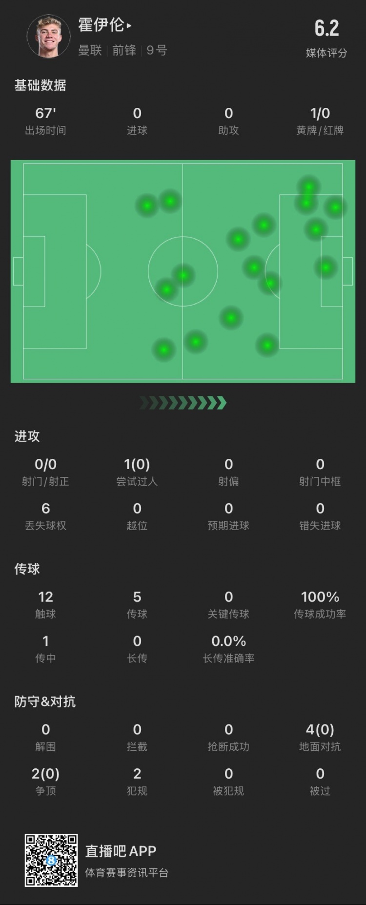 2月27日訊 英超第27輪,曼聯(lián)主場對陣伊普斯維奇的比賽正在進行。第67分鐘,霍伊倫被換下場。本場比賽,他射門、關鍵傳球多項重要數(shù)據(jù)掛零,0對抗成功、0過人成功,獲評6.2分。