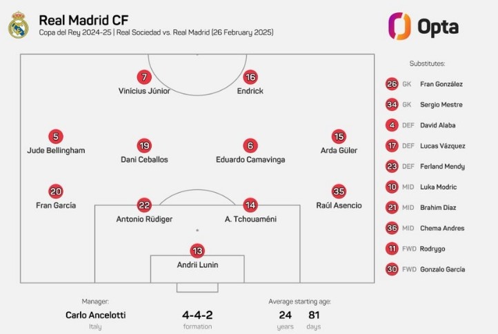 2月27日訊 國王杯半決賽首回合皇馬對(duì)陣皇家社會(huì)的比賽即將開始,雙方首發(fā)陣容公布。
