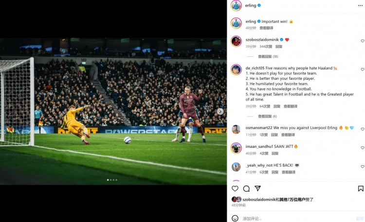 2月27日訊 在本輪英超,曼城1-0小勝熱刺。本場比賽哈蘭德打進(jìn)唯一進(jìn)球,賽后他也在個(gè)人社媒曬出本場破門瞬間照片,配文寫道:“拿下一場重要的勝利!” 標(biāo)簽: 足球 英超 曼城