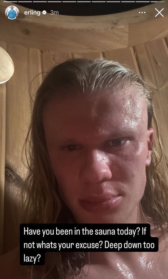 哈蘭德曬出自己蒸桑拿的照片,并配文:“你今天蒸桑拿了嗎?如果沒有,你的借口是什么?內(nèi)心深處太懶?”