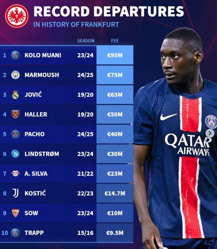 3月2日訊 《轉(zhuǎn)會(huì)市場(chǎng)》統(tǒng)計(jì)了法蘭克福隊(duì)史賣(mài)人最貴榜,穆阿尼以9500萬(wàn)歐元居首。