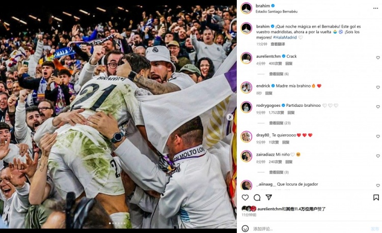 本場(chǎng)比賽迪亞斯破門,賽后他也在個(gè)人社媒曬出瘋狂慶祝進(jìn)球的照片,配文寫道:“多么神奇的伯納烏夜晚,進(jìn)球獻(xiàn)給你們,皇馬球迷們,現(xiàn)在專注于下回合比賽。你們是最棒的!”