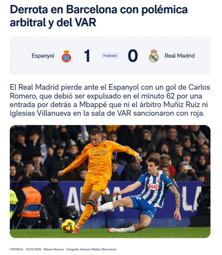 皇馬因?yàn)榭逅?羅梅羅的進(jìn)球輸給了西班牙人,而羅梅羅本應(yīng)在第62分鐘因背后鏟倒姆巴佩被罰下場,但主裁判穆尼茲-魯伊斯和VAR室的伊格萊西亞斯-比利亞努埃瓦都沒有給他紅牌。