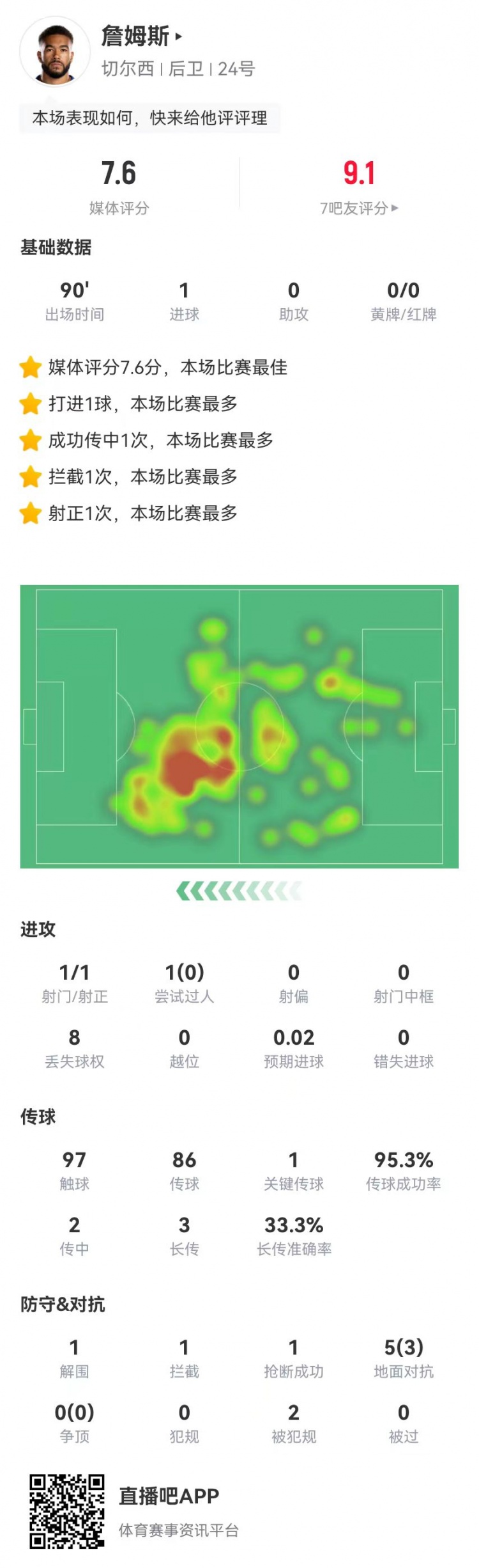 3月7日訊 切爾西在本輪歐協(xié)聯(lián)2-1擊敗哥本哈根,里斯-詹姆斯客串后腰數(shù)據(jù)如下: