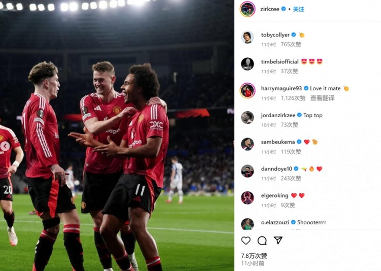 兩人也都在賽后通過社媒曬出比賽照紀念,但沒有附加文字內(nèi)容。而隊長馬奎爾則現(xiàn)身齊爾克澤的評論區(qū)并夸獎:“愛了,兄弟!”