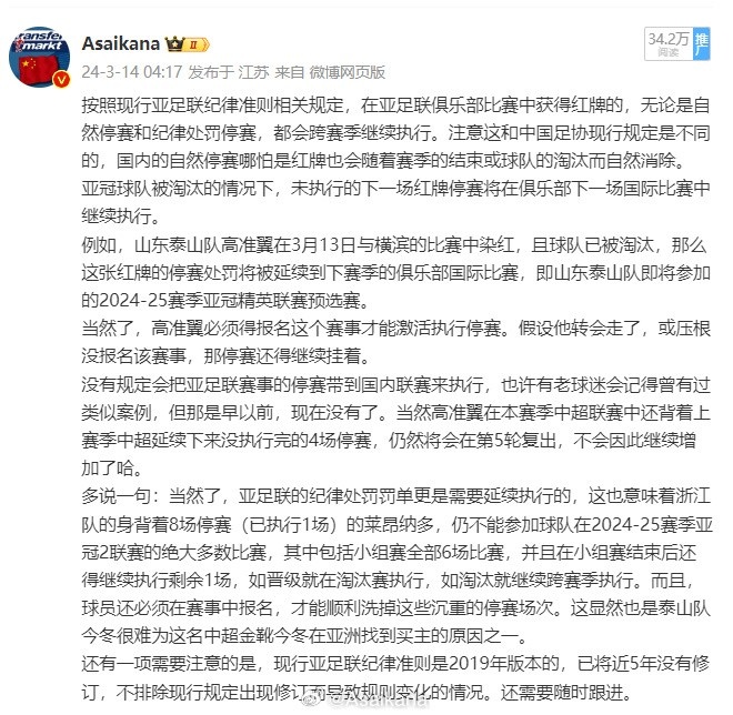 而亞足聯(lián)則相反,紅牌自然停賽需要跨賽季執(zhí)行?,F(xiàn)中足聯(lián)和中國(guó)足協(xié)已經(jīng)分家,中足聯(lián)目前還是和中國(guó)足協(xié)保持一致,如果中足聯(lián)日后出臺(tái)與之不同的新的停賽執(zhí)行細(xì)則,職業(yè)聯(lián)賽范疇內(nèi)當(dāng)然也是要以中足聯(lián)的規(guī)定為準(zhǔn)。