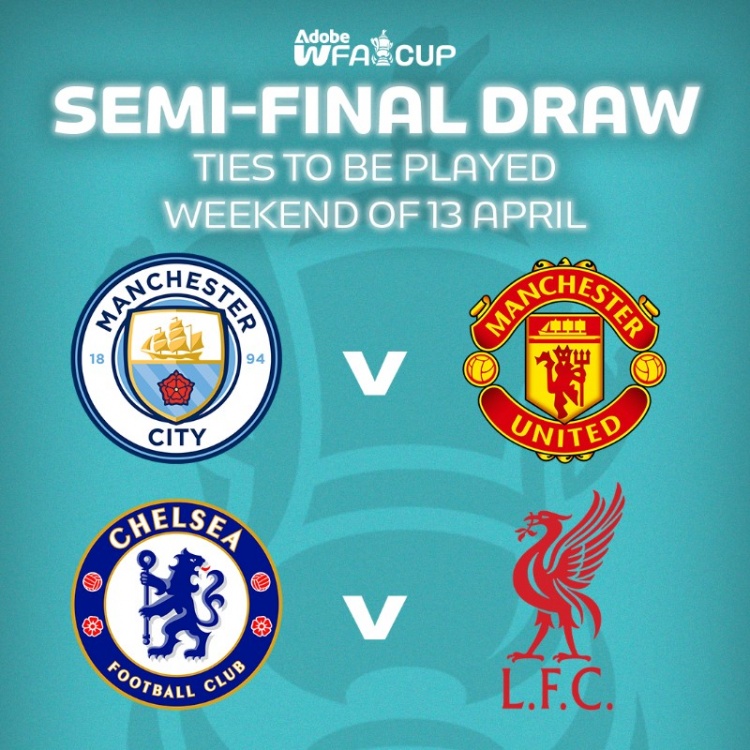 經(jīng)過抽簽,女足足總杯半決賽對陣為曼城vs曼聯(lián)、切爾西vs利物浦,比賽將于4月13日的那個周末進行。
