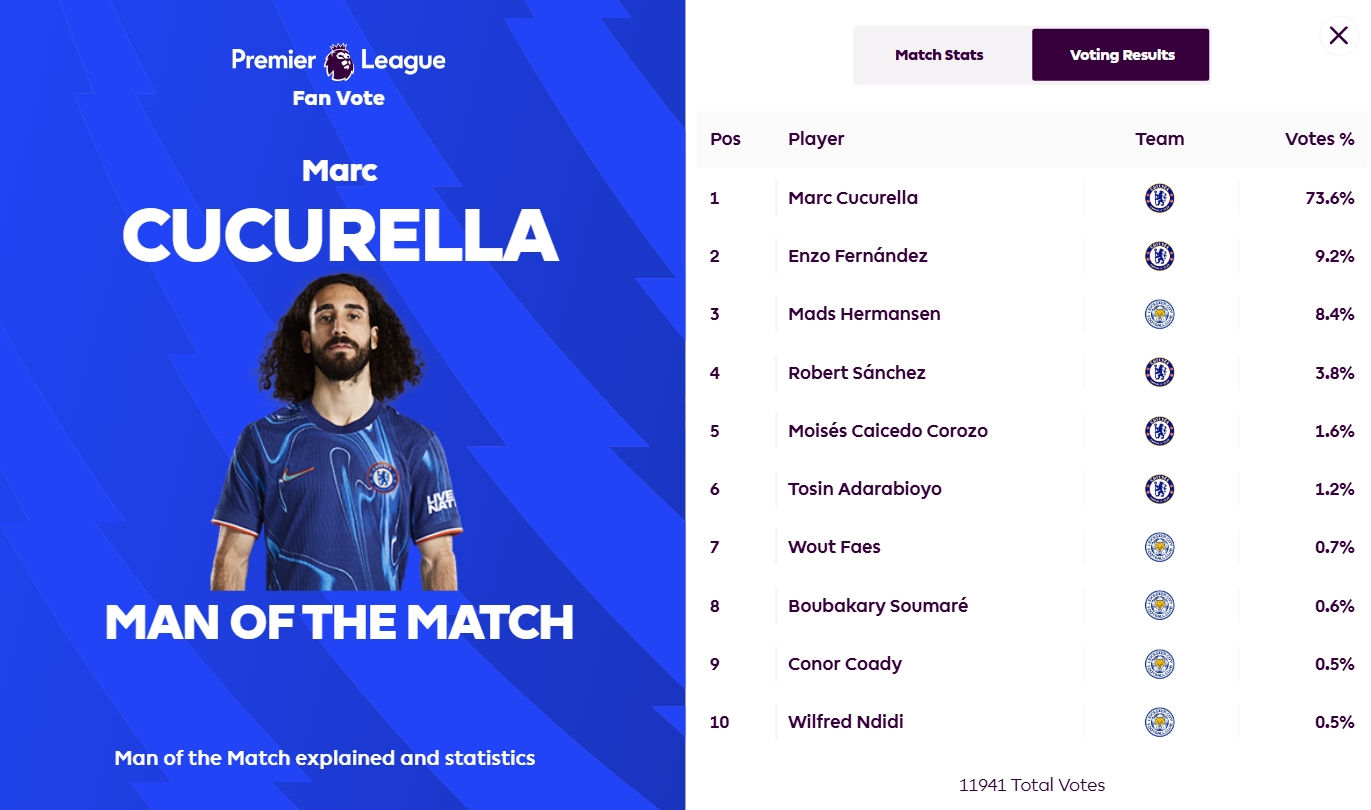 制勝進球!庫庫雷利亞73.6%得票率當選切爾西1-0藍狐一役全場最佳
