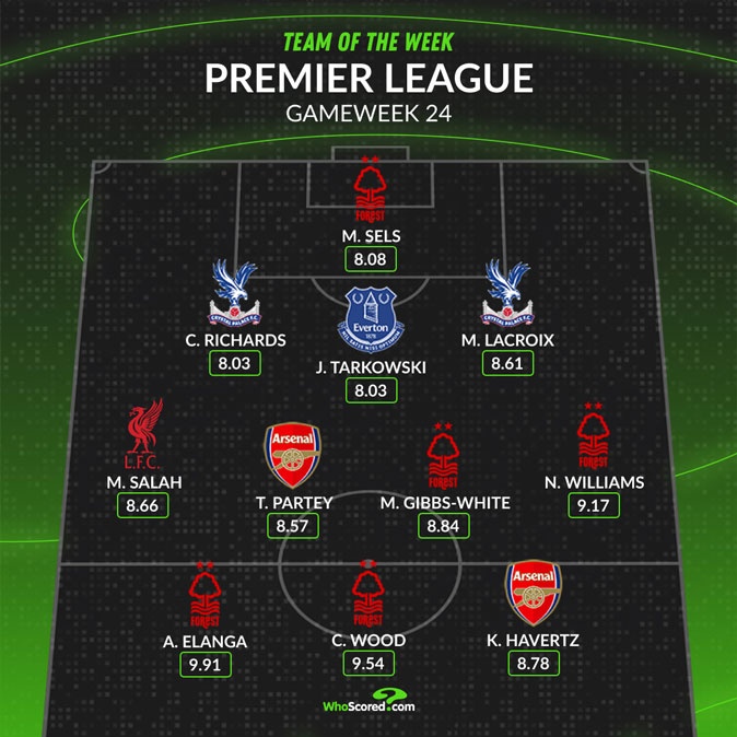 WhoScored英超第24輪最佳陣:薩拉赫、哈弗茨在列,諾丁漢森林5人