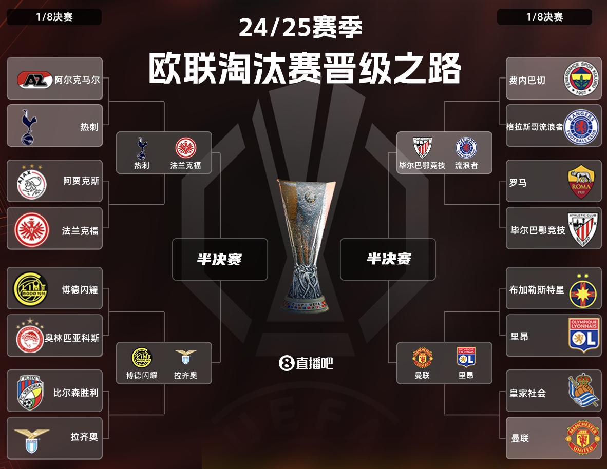 ??歐聯(lián)8強對陣:曼聯(lián)vs里昂,流浪者vs畢巴,熱刺vs法鷹