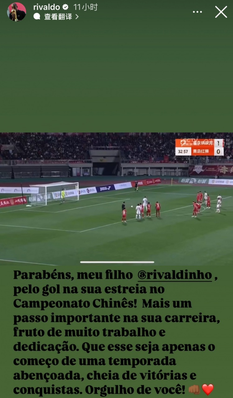 賽后,里瓦爾多在社媒曬出了兒子的進(jìn)球視頻并配文祝賀寫道: