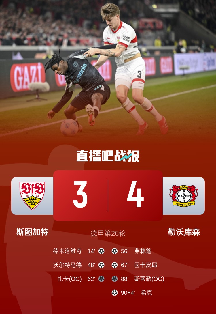 ??搜a(bǔ)時(shí)頭球絕殺,勒沃庫森4-3逆轉(zhuǎn)斯圖加特。積分榜方面,勒沃庫森落后拜仁6分。