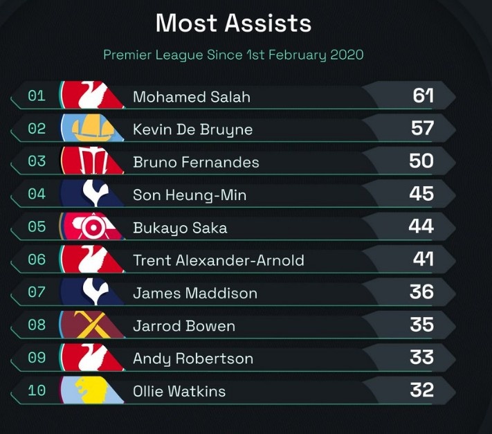 3月17日訊 在本輪英超曼聯(lián)3-0大勝萊斯特城的比賽中,B費(fèi)助攻雙響,個(gè)人英超助攻數(shù)達(dá)到50次。以下為自B費(fèi)2020年2月英超首秀以來(lái)英超同期助攻榜: