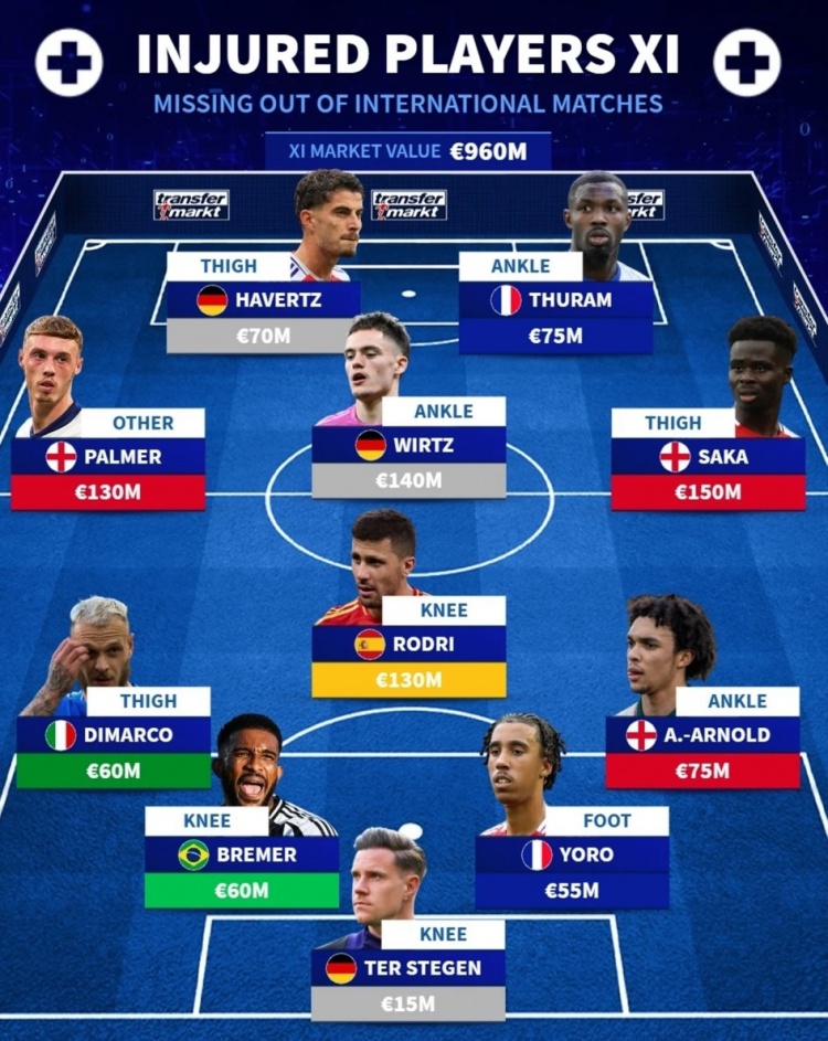 3月20日訊 德國轉(zhuǎn)會市場列出了因傷缺席國家隊比賽的球員陣容,薩卡、帕爾默、維爾茨、羅德里、阿諾德在列。