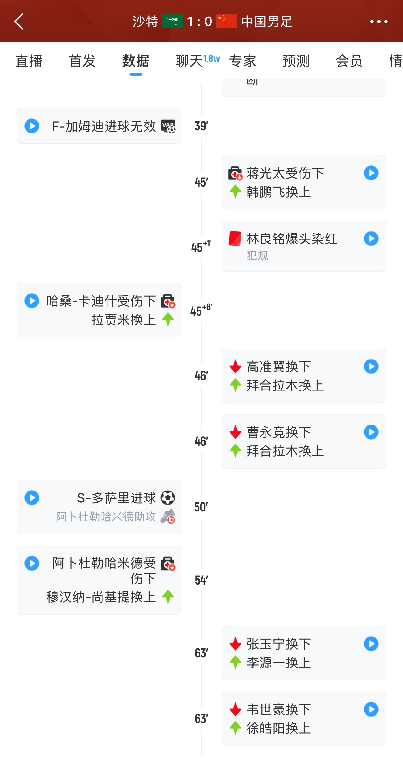 比賽第62分鐘,國足已經(jīng)用完了全部5個(gè)換人名額,先后登場的球員分別是韓鵬飛、拜合拉木、楊澤翔、徐皓陽、李源一,歸化國腳塞爾吉尼奧無緣國足首秀!