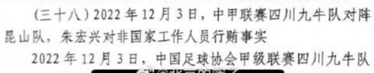 2022年12月3日,中甲聯(lián)賽四川九牛隊(duì)對陣?yán)ド疥?duì),朱宏興對非國家工作人員行賄事實(shí)。