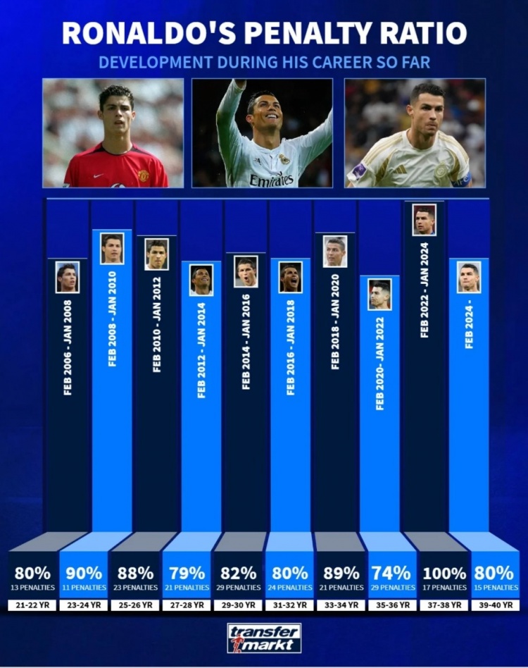 3月24日訊 德國轉(zhuǎn)會市場統(tǒng)計(jì)了C羅不同年齡段的點(diǎn)球命中率,并排出列表,C羅37到38歲點(diǎn)球命中率100%最高,39到40歲點(diǎn)球命中率80%。