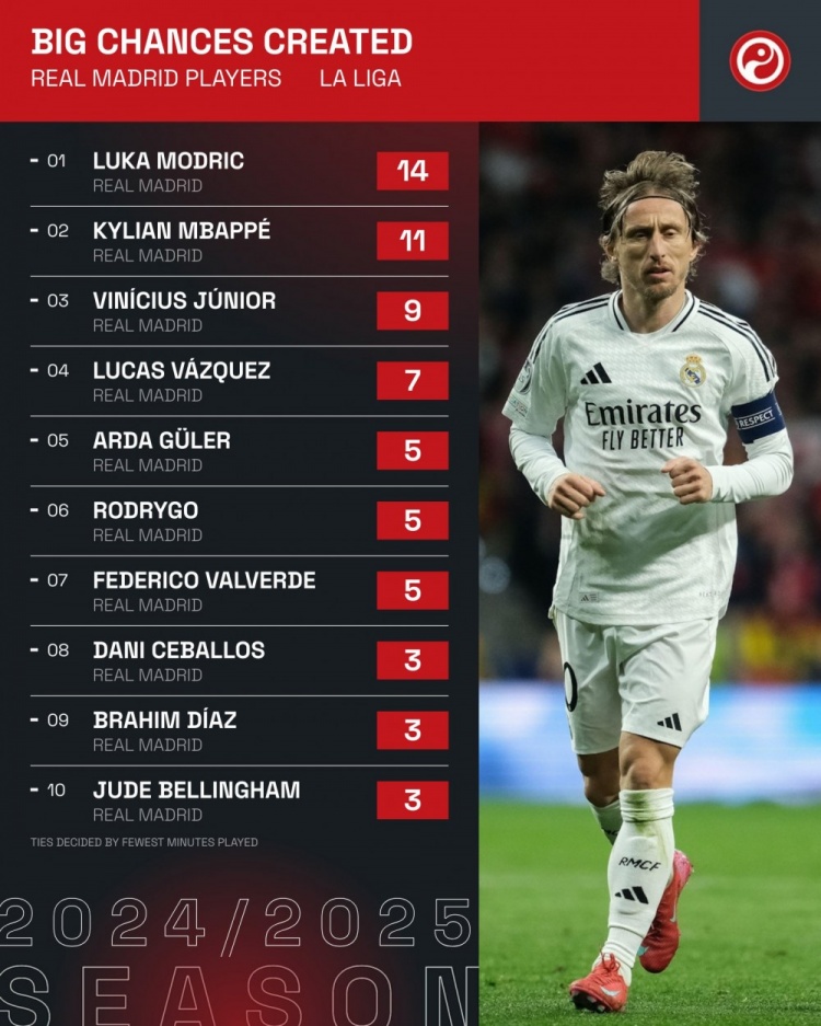 據(jù)統(tǒng)計,盡管本賽季只首發(fā)出戰(zhàn)了11場比賽,但莫德里奇本賽季在西甲創(chuàng)造機(jī)會的次數(shù)仍然是全隊(duì)最高,比第二名的姆巴佩多出三次。