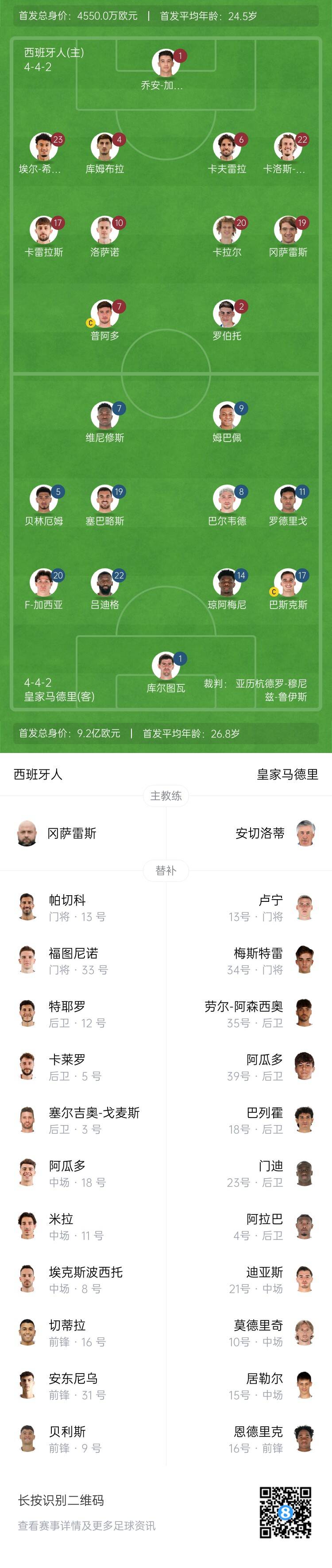 皇馬首發(fā):1-庫(kù)爾圖瓦、17-巴斯克斯、14-瓊阿梅尼、22-呂迪格、20-弗蘭-加西亞、8-巴爾韋德、19-塞巴略斯、5-貝林厄姆、11-羅德里戈、7-維尼修斯、9-姆巴佩