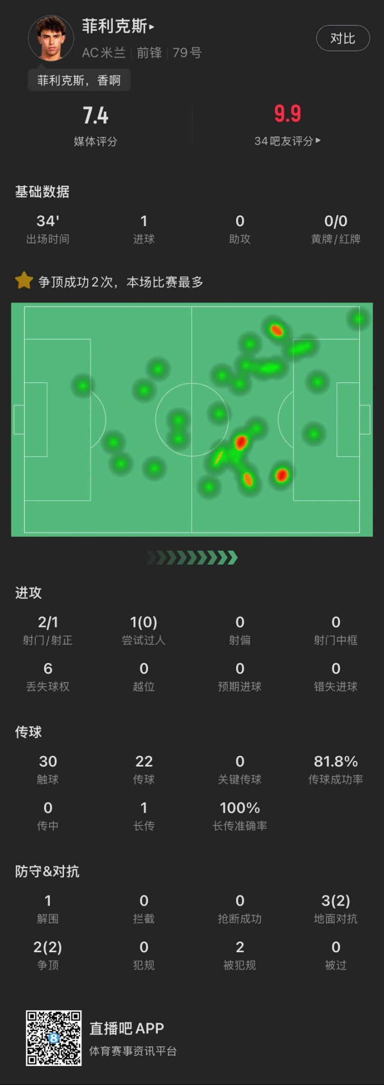 菲利克斯米蘭首秀數(shù)據(jù)↓