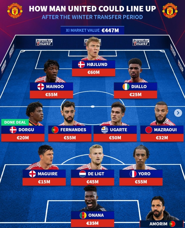 2月7日訊 五大聯(lián)賽冬窗已經(jīng)結(jié)束,《轉(zhuǎn)會(huì)市場(chǎng)》也根據(jù)補(bǔ)強(qiáng)預(yù)測(cè)了曼聯(lián)的主力陣容。
