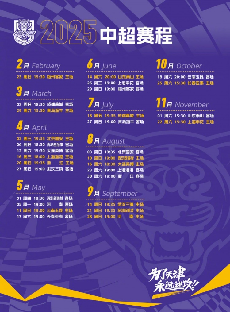 1.2025賽季中超聯(lián)賽天津津門虎隊(duì)全部主場(chǎng)賽事