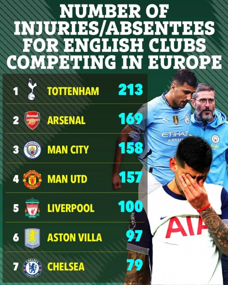 據(jù)統(tǒng)計(jì),熱刺傷病比本賽季參加歐戰(zhàn)的任何英超球隊(duì)都要嚴(yán)重25%。在39場(chǎng)比賽中,熱刺總?cè)毕舜芜_(dá)到213人次,比排名第二的阿森納多出44人。