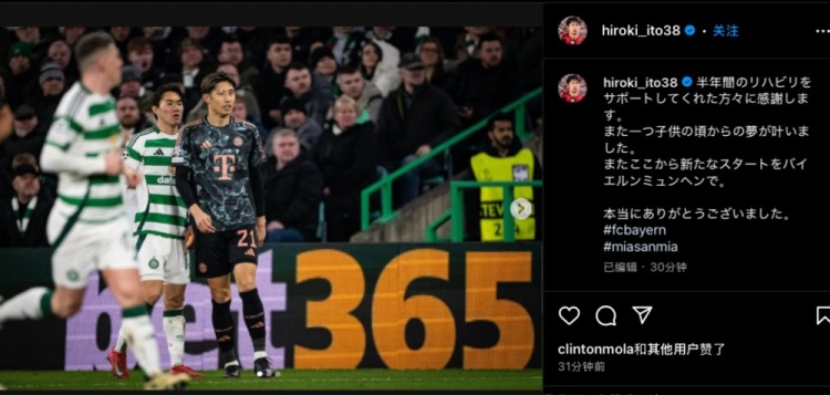賽后伊藤洋輝在社媒發(fā)文,他寫道:“感謝這半年間幫助我進行康復(fù)的各位。自己小時候的又一個夢想實現(xiàn)了,這是自己拜仁生涯的新的開始。真的,非常感謝各位的幫助與支持。”